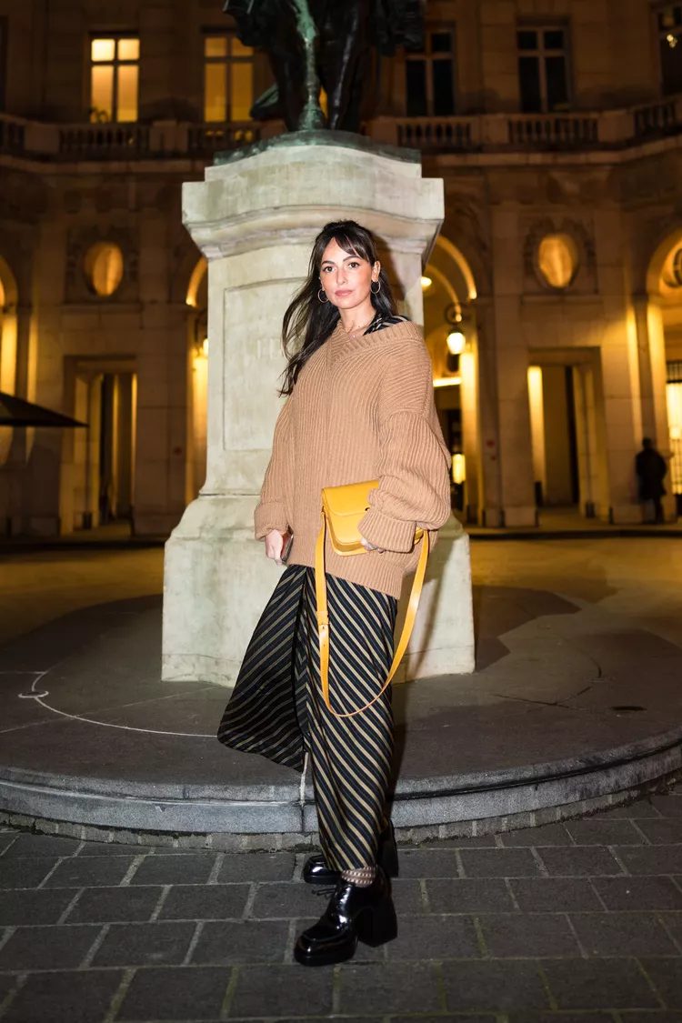 You don’t need to worry if you hesitated before buying an oversized Breton-striped sweater, thinking that the horizontal stripes would make a piece already wide look even wider. The v-neck will keep the sweater from looking too bulky. A matching mini will also add length and cohesion.