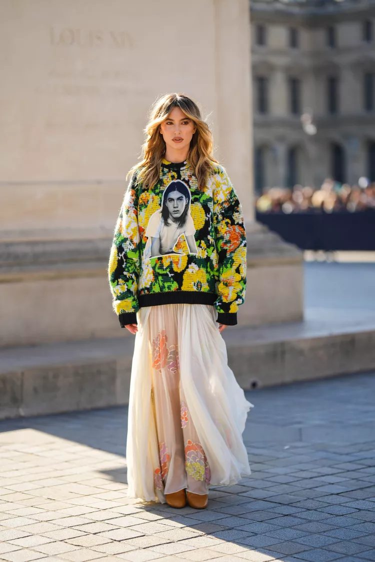 A maximalist pattern can take an oversized sweater to the next level. The neutral maxi dress, which still compliments the pattern, helps to elongate your look and take the focus off the central design.
