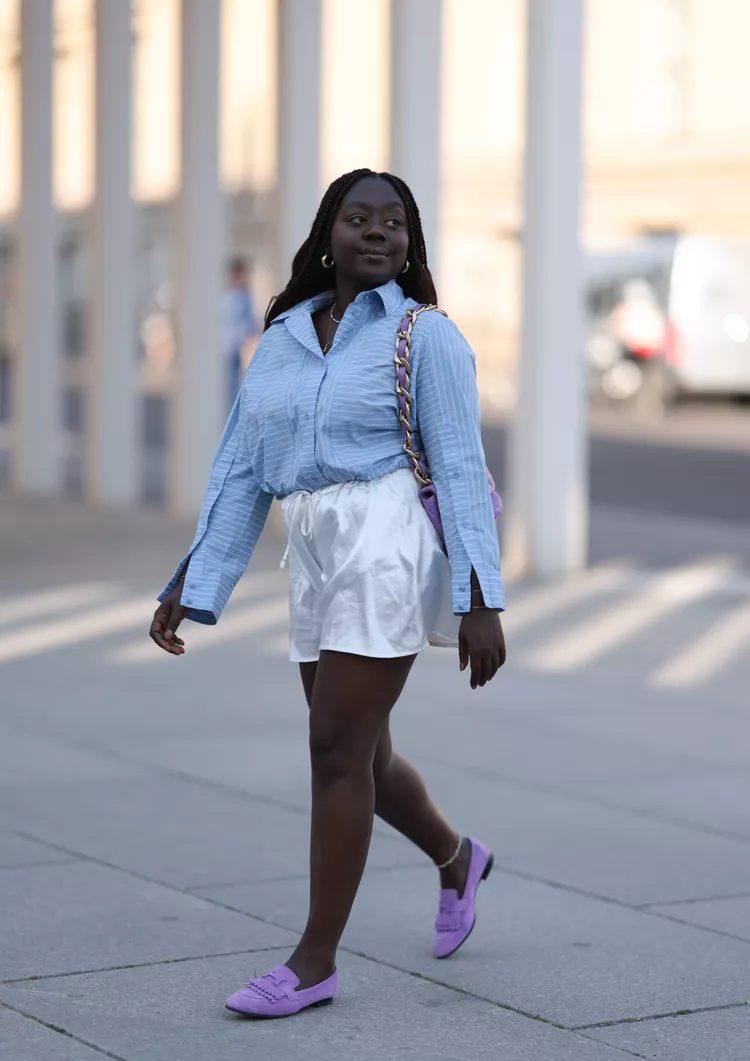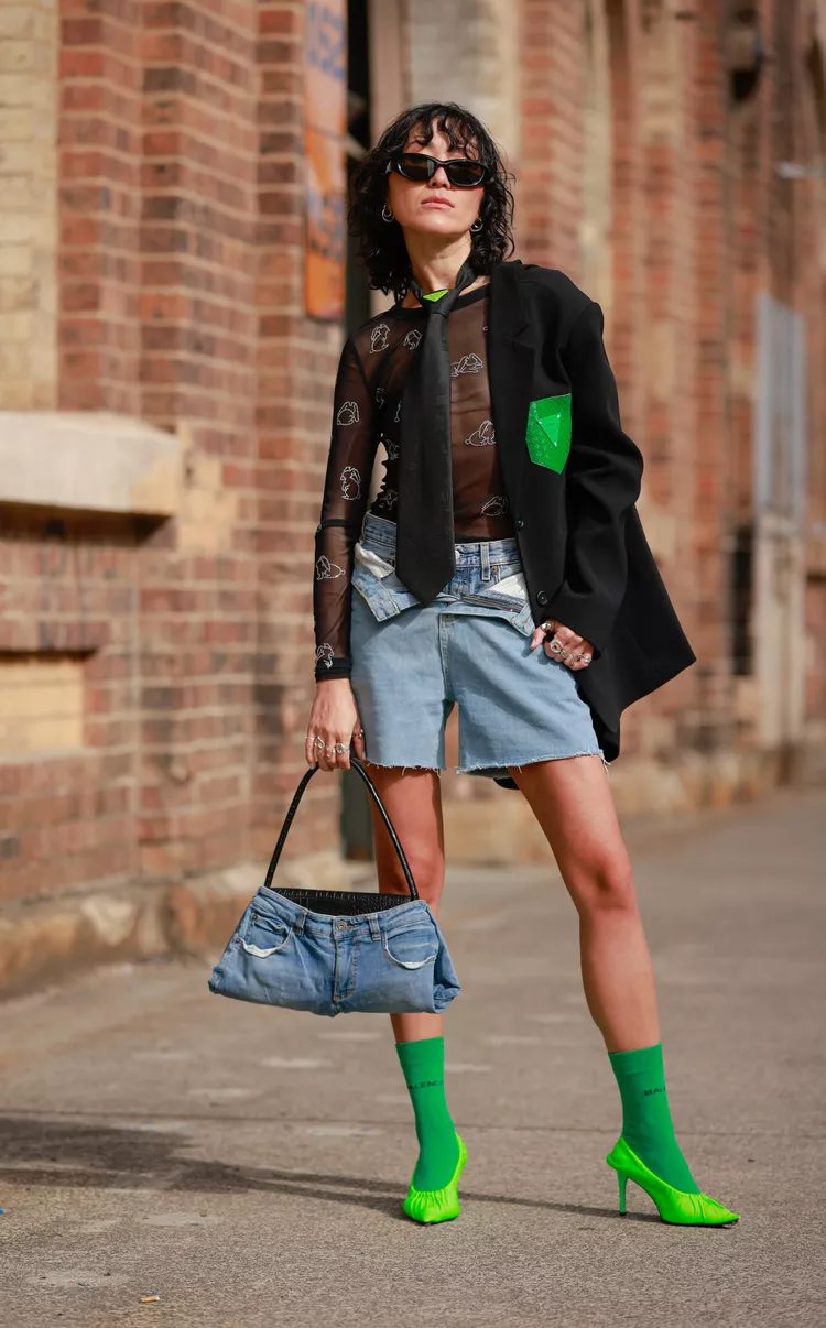 Classic pumps are a great option for shorts outfits. They can be worn in a subversively stylish way with denim shorts or dressed up and elevated with paper bag briefs. Are you worried about sweaty feet when wearing leather heels? Add a pair sheer statement socks to embrace your inner street-style star.