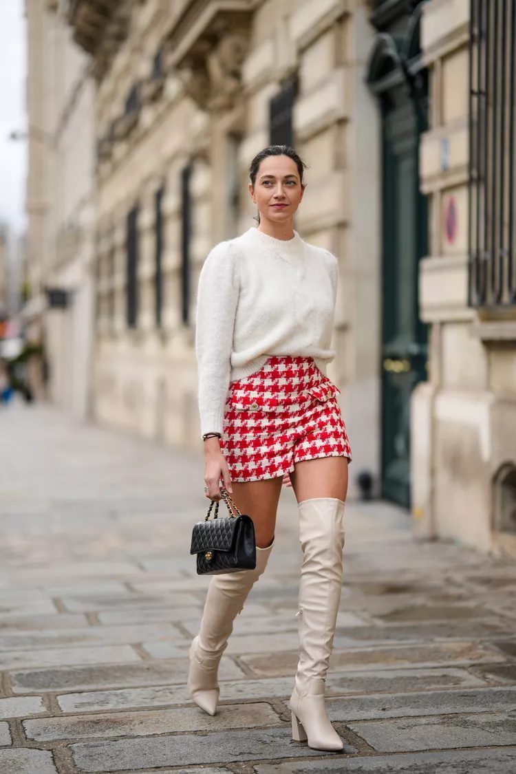 Over-the-knee booties with shorts are the ultimate in fashion. For daywear, we recommend light colors and timeless prints, luxury separates. What is the perfect fit for this shoe style? Cashmere sweater with checked shorts, cream over-the-knee booties and a checkered high-waisted skirt.