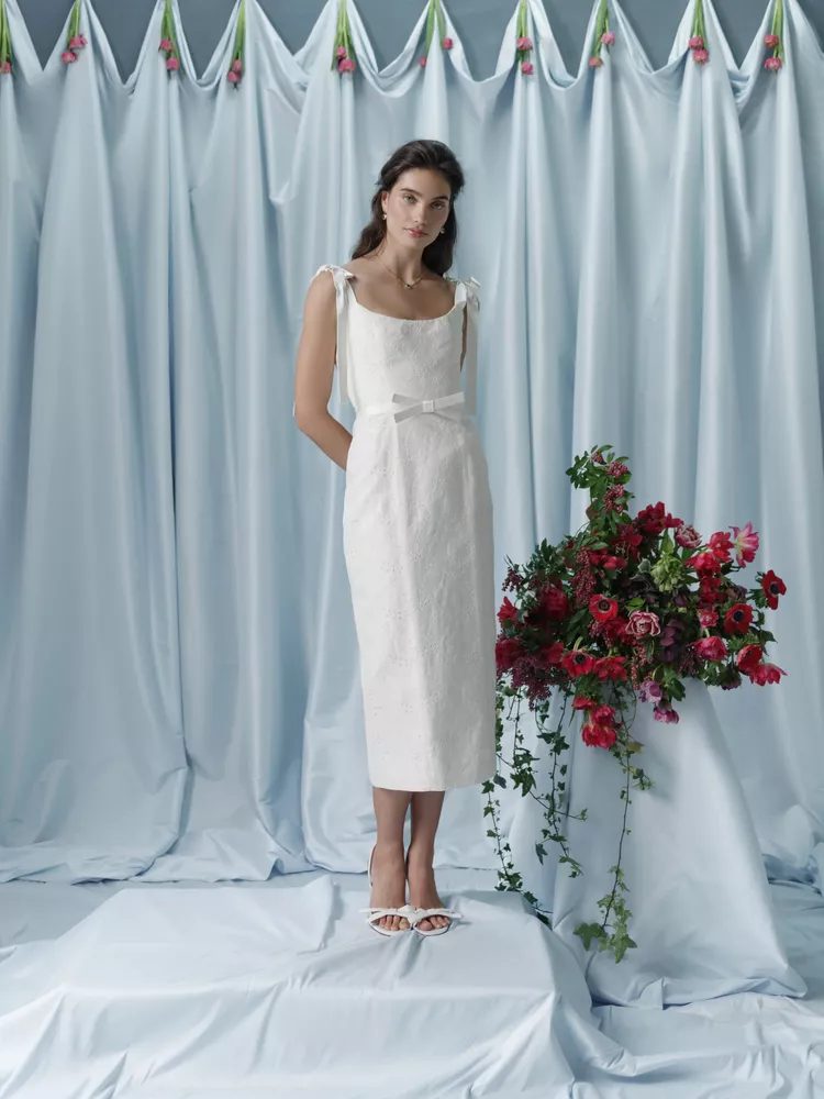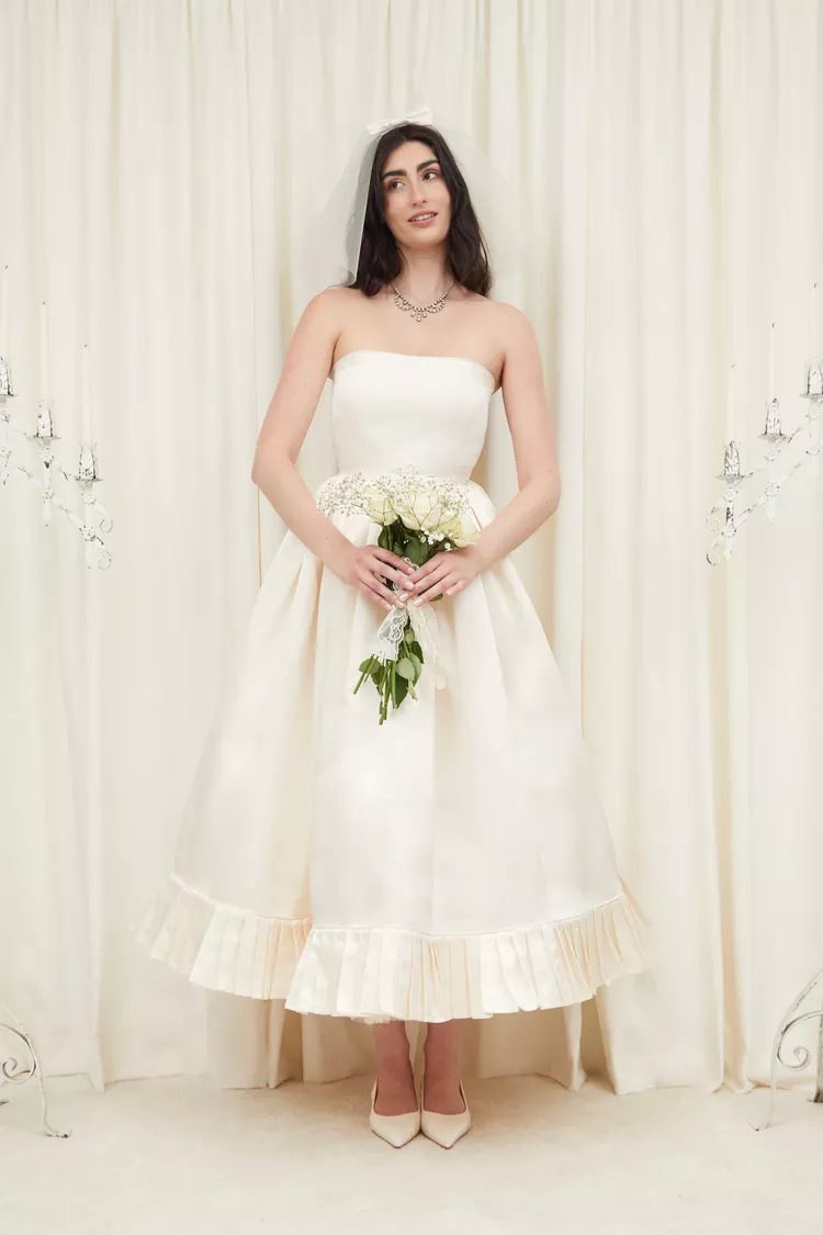 A tea-length dress is a great option if you want a classic silhouette. Tanner Fletcher’s dress with ruffled trim emphasizes its cropped hemline. The ivory color gives it a vintage vibe. Accessorize this vintage look with pearl drop earrings and satin or tulle glove.