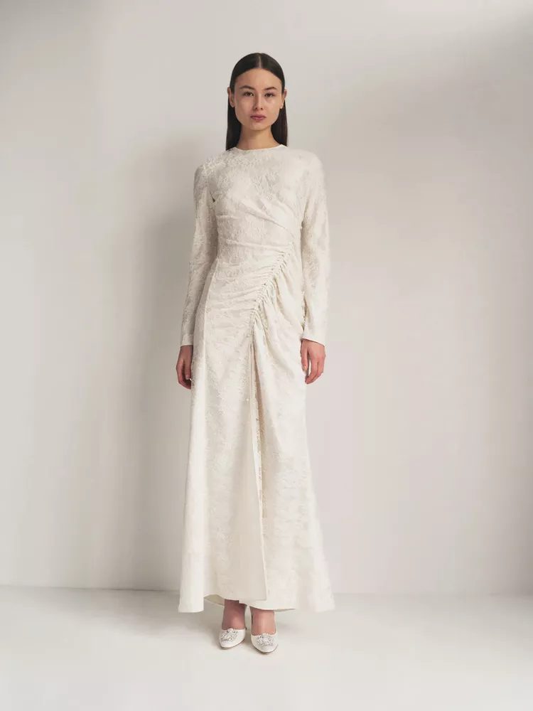 A classic lace gown is a great choice for any wedding event. This Alejandra Rojas dress has long sleeves, a floor-sweeping skirt and asymmetrical ruching for a modest yet sultry look. If you want to amp up the sultry look, choose a version that has a corset or mini-length bodice.