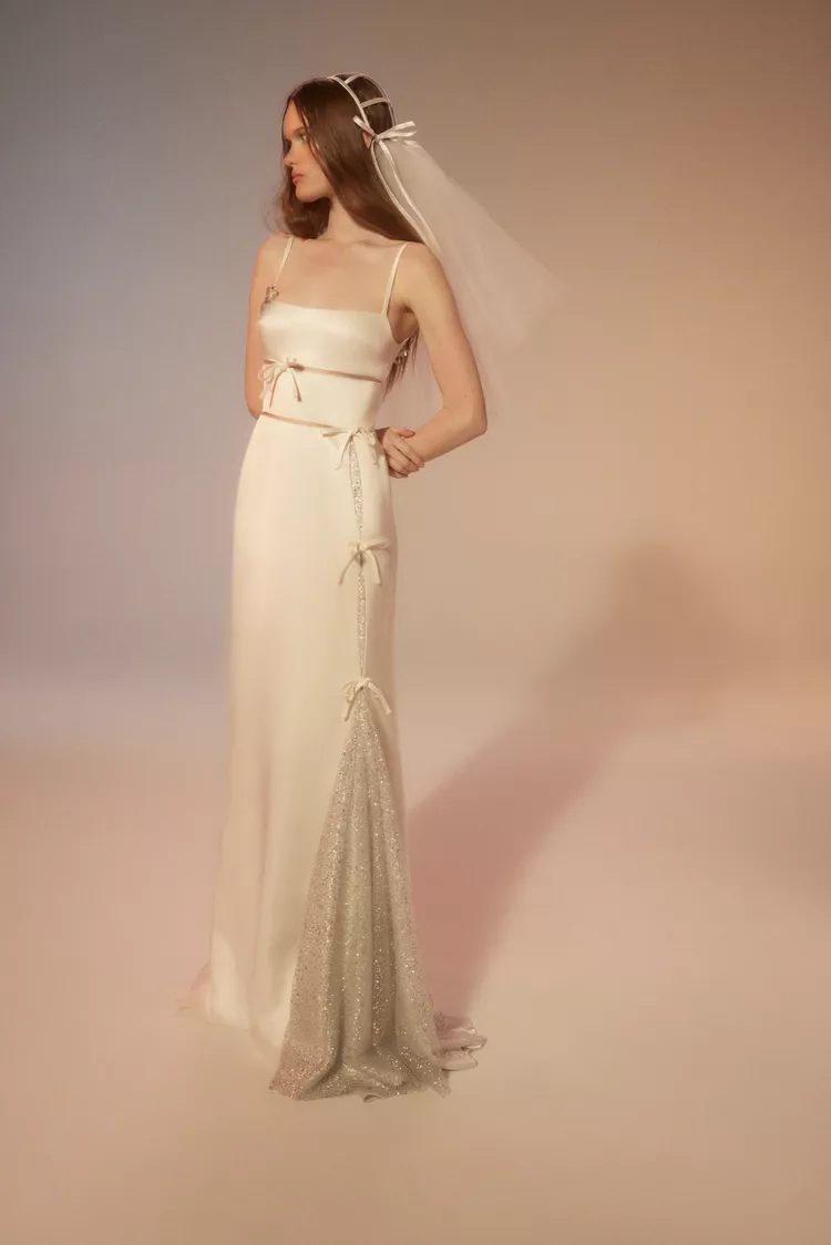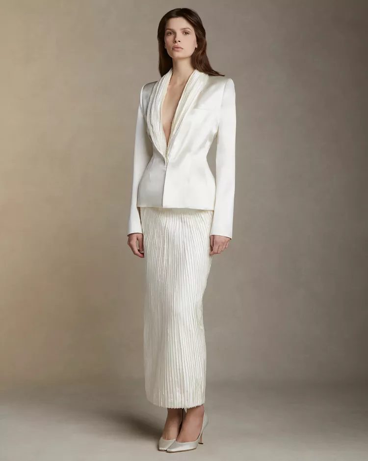 The jumpsuit may be the dress of choice for brides but we prefer a stylish suit set. Danielle Frankel elevated this formal look with pleats, a satin finish on the pencil skirt, and blazer. To finish the look, swap a shirt with a lariat neckpiece.