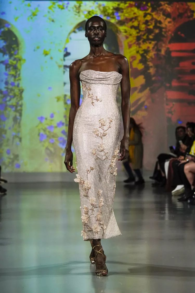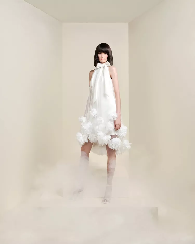 Are you planning an engagement party for spring or summer this year? A floral dress can be a fun and chic option. Viktor&Rolf’s design has a high neckline that adds sophistication to the mini silhouette.