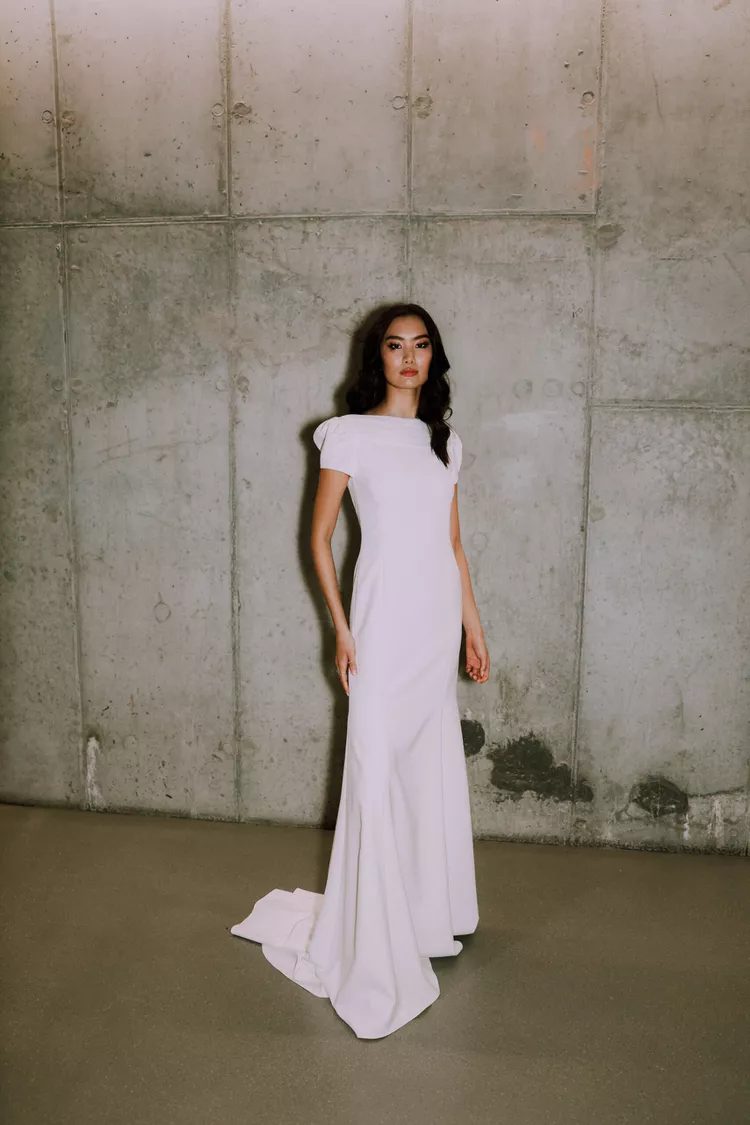 As a bride, sometimes simple and chic are all you need. Andrew Kwon’s sleek design has cap sleeves, a high neckline and an open back. It is a simple yet elegant look. Accessorize the dress with white pumps and cluster earrings.