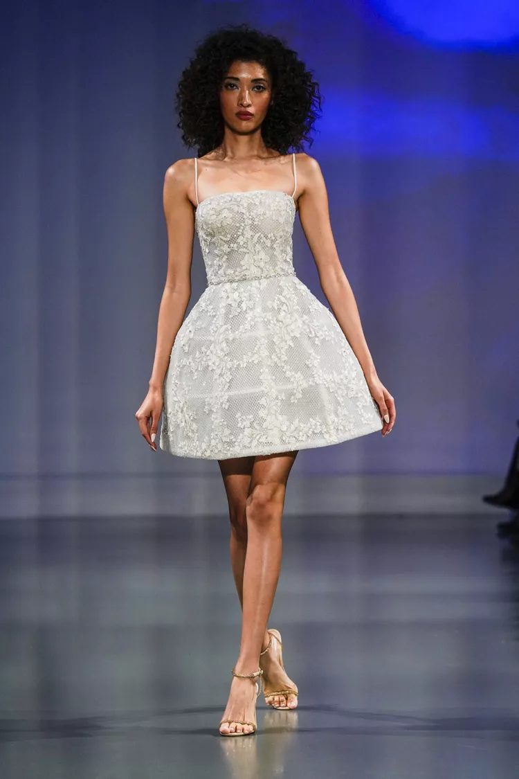 What’s a party without streamers, anyway? Of course, chiffon straps. Savannah Miller’s white satin mini dress is an elegant choice for any engagement party. But it isn’t without intrigue. Wrap-style bodice and statement straps combine to create an ethereal bridal outfit that will have you twirling all night on the dancefloor.