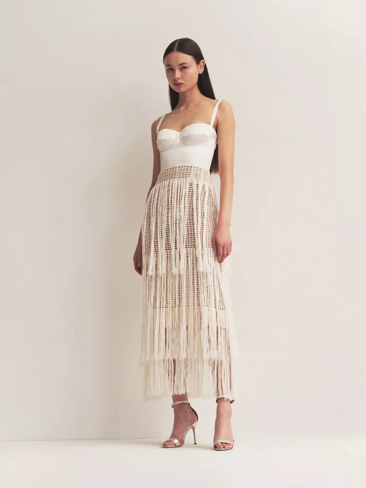We love the idea that a boho look would be perfect for an engagement party on the beach. The midi-length silhouette is elevated with a bustier bodice and fringed skirt. This outfit can be easily repurposed. The look can be finished with a white scarf and footwear that is beach-friendly, such as wedges or sandals.