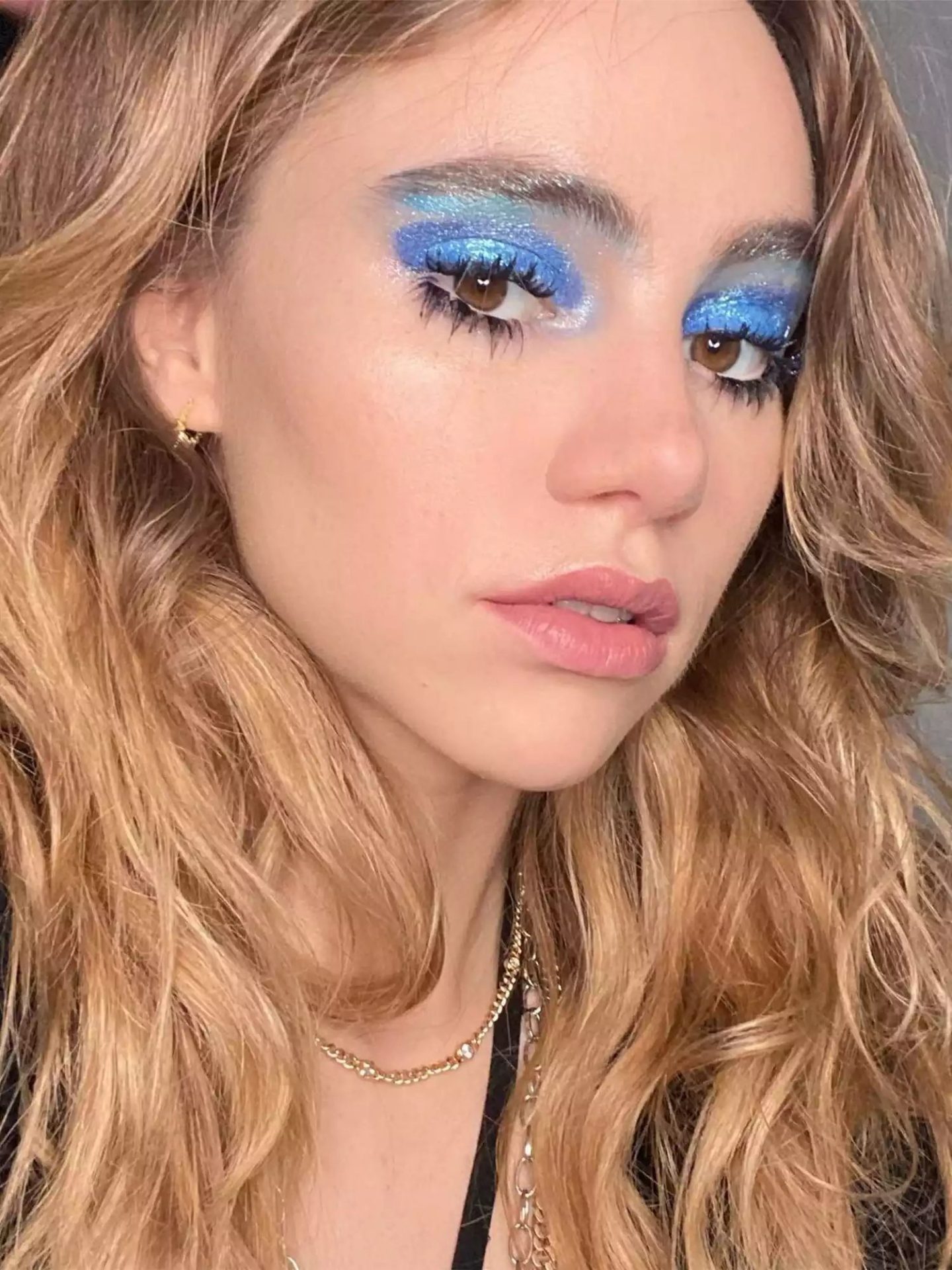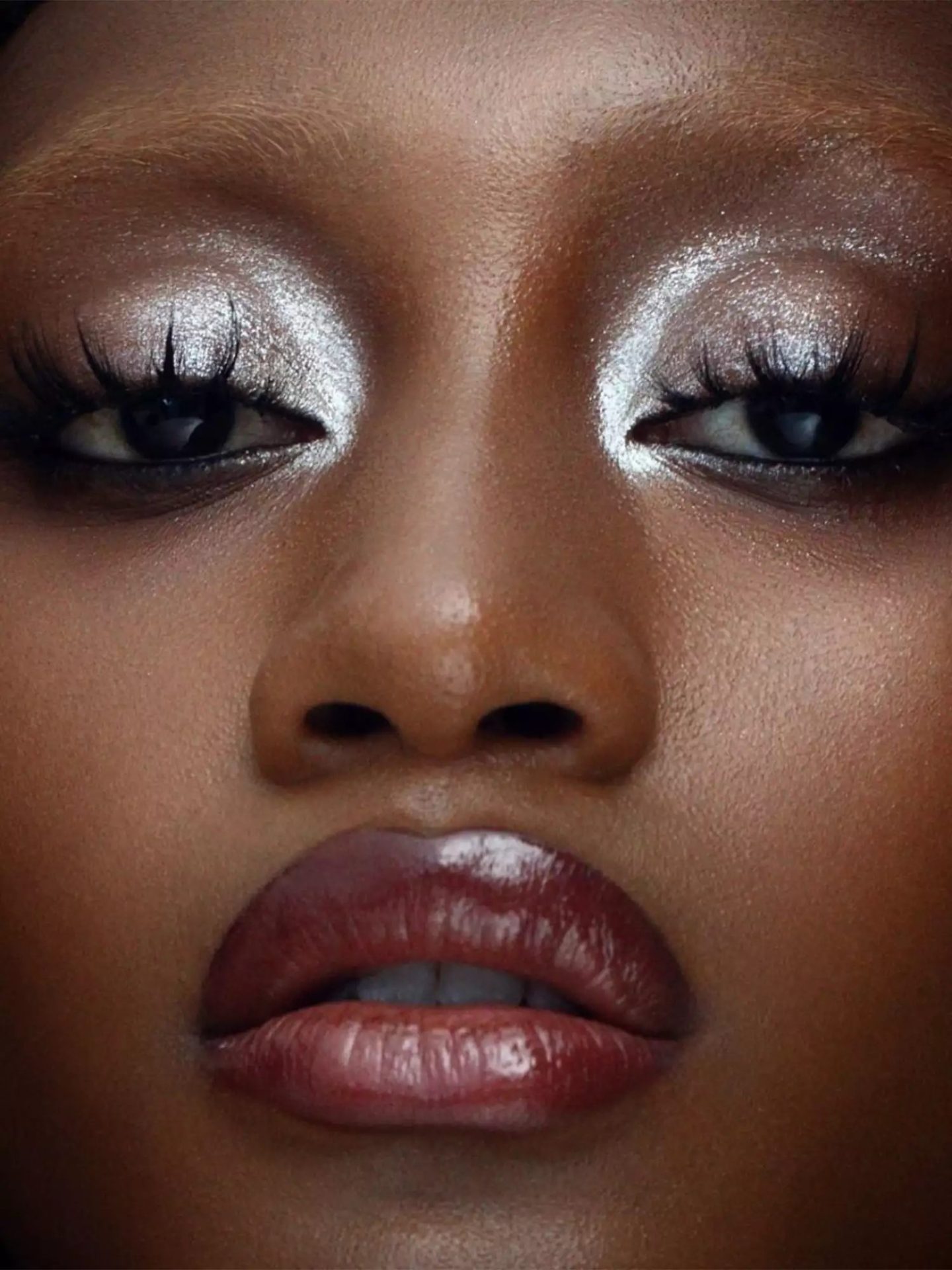 The longer and more spidery the lashes are, the better. The metallic silver eyeshadow and glossy burgundy lip give off a ’60s vibe in a galaxy way.