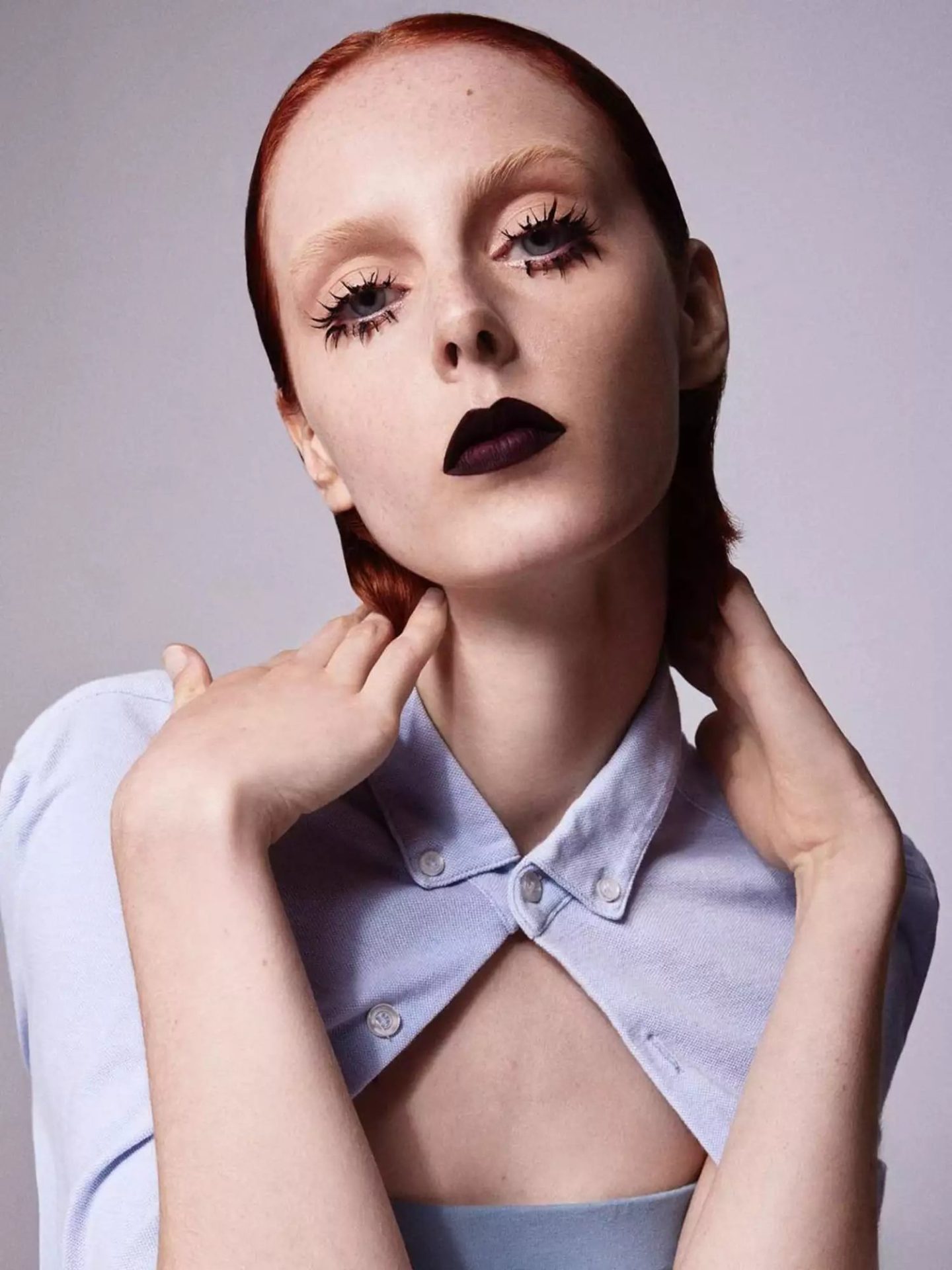 The precision with which the mascara is applied makes ’60s trends so much fun to wear. Apply a few coats with a comb-brush of mascara to achieve this separated lash effect.