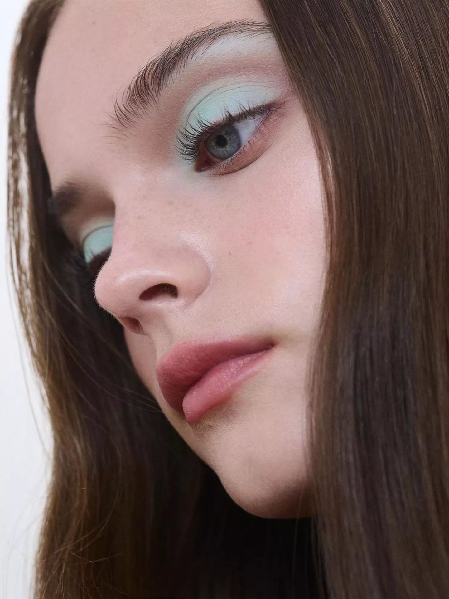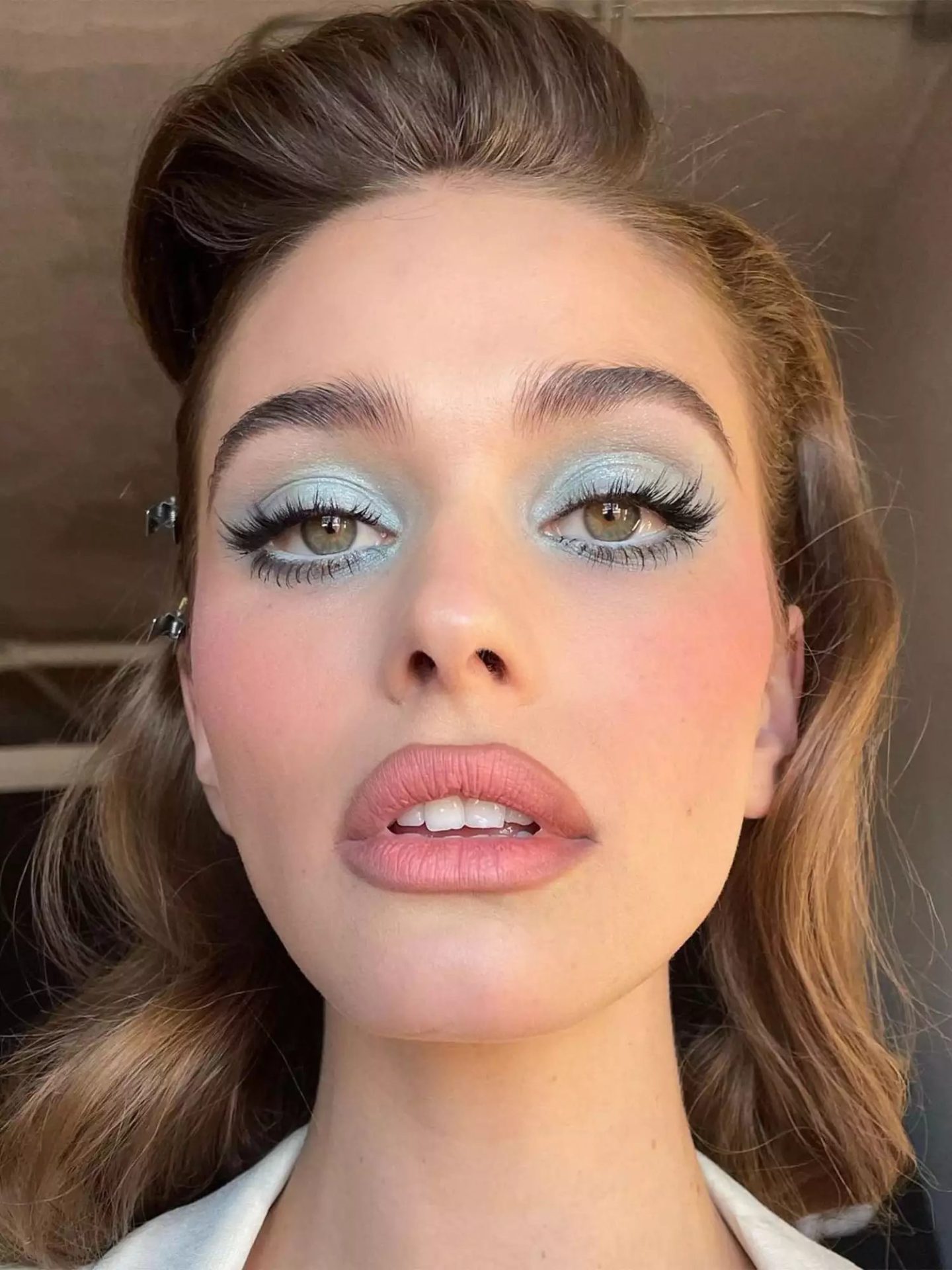 What is not to like about this look. This look is a homage to the ’60s. The matte pink lips and lips with matte blush, baby blue eyeshadows, and voluminous long lashes are all reminiscent of that era.