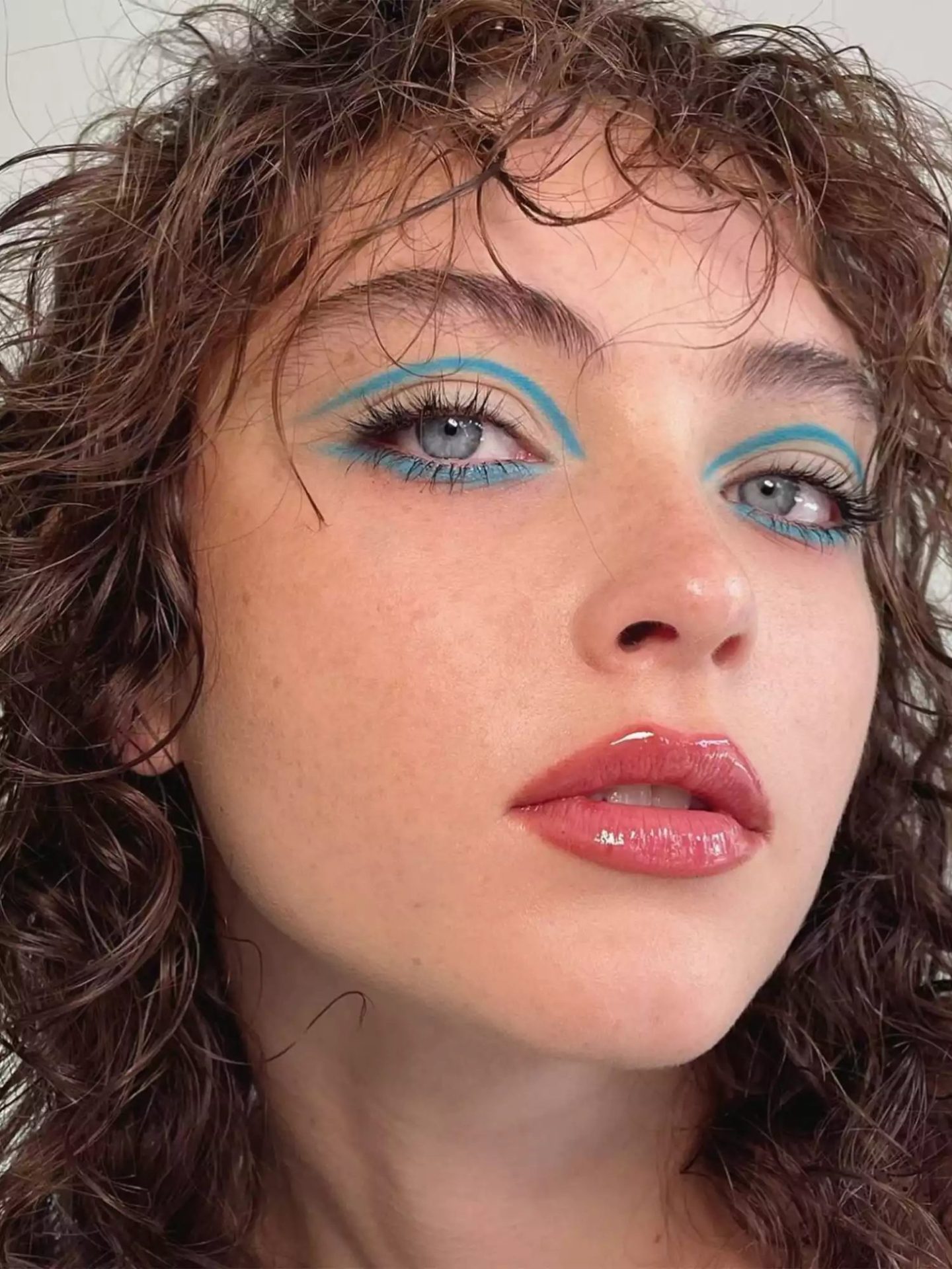 Apply blue eyeliner to the crease of your eyelids and below the lashline. Your eye look will be powerful with glossy lips and a naturally flushed face.