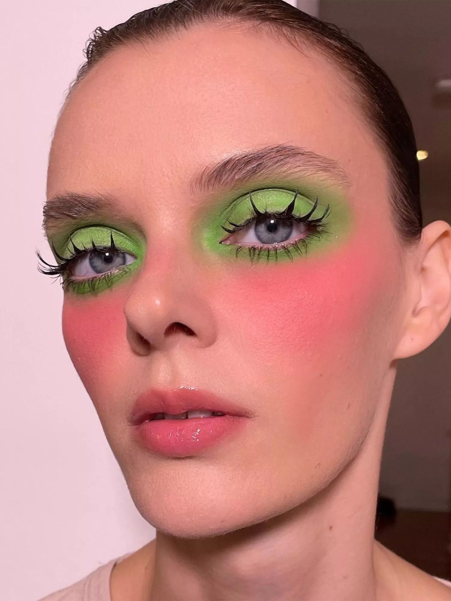 This makeup looks hits all of the classic ’60s styles, from doe-eyed eyes to fresh flushed cheeks. The lips and cheeks are painted in complementary colors, proving monochromatic trends never go out of style.