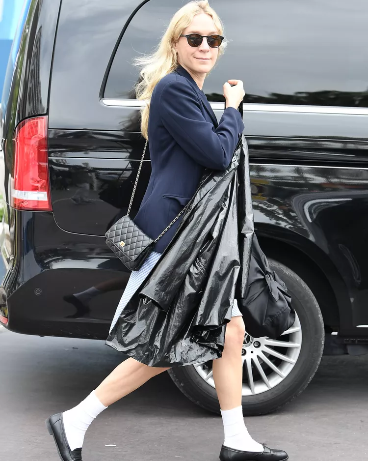 Sevigny opted for a vinyl jacket look, but this time she went with a librarian-inspired aesthetic. Style icon Sevigny kept it smart in a blue jacket and striped skirt. She paired the look with black loafers and her white socks.