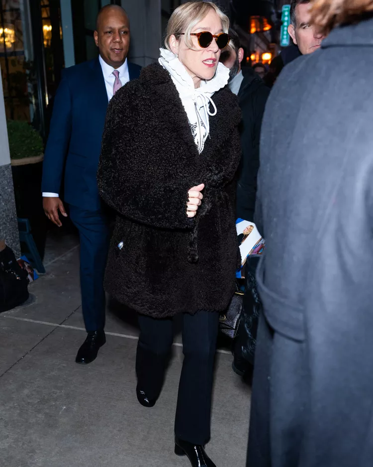 Sevigny is a master of accessorizing. In 2018, while in Park City, Utah to attend the Sundance Film Festival, the Boys Don’t Cry star paired her faux fur black coat with straight leg denim and ankle boots. Her cheeky space bun is the star of this look.