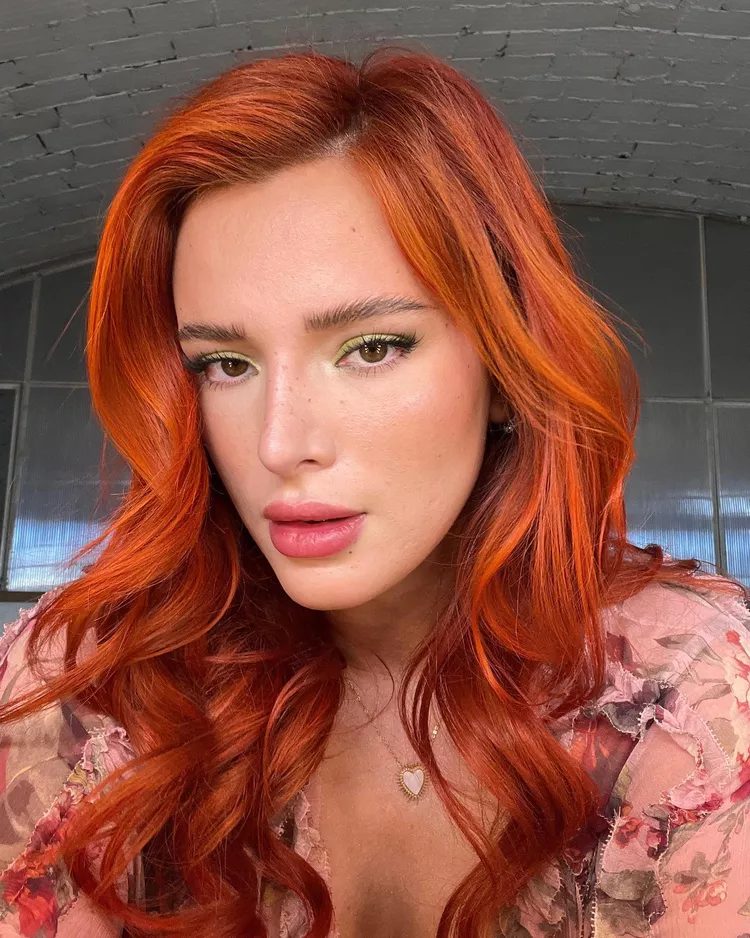 Nobody does bold red hair quite like Bella Thorne. Lorena Valdes, colorist at Maxine in Chicago, described this as an intense copper red with ribbons to create lowlights, and copper orange for highlights. This multi-dimensional colour is created by the color. To recreate this look, request all-over color after balayage and highlights and lowlights.