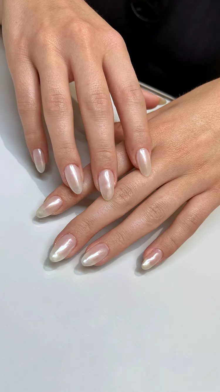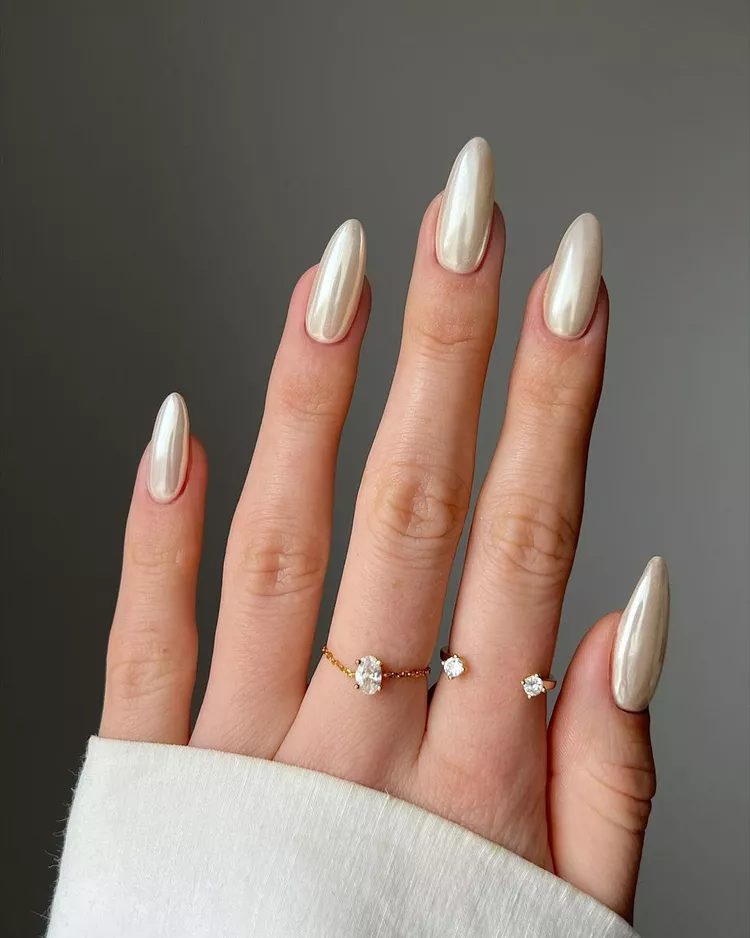 The metallic shine is both unexpected and mesmerizing. One shade shines a little more than the others: vanilla chrome nails.