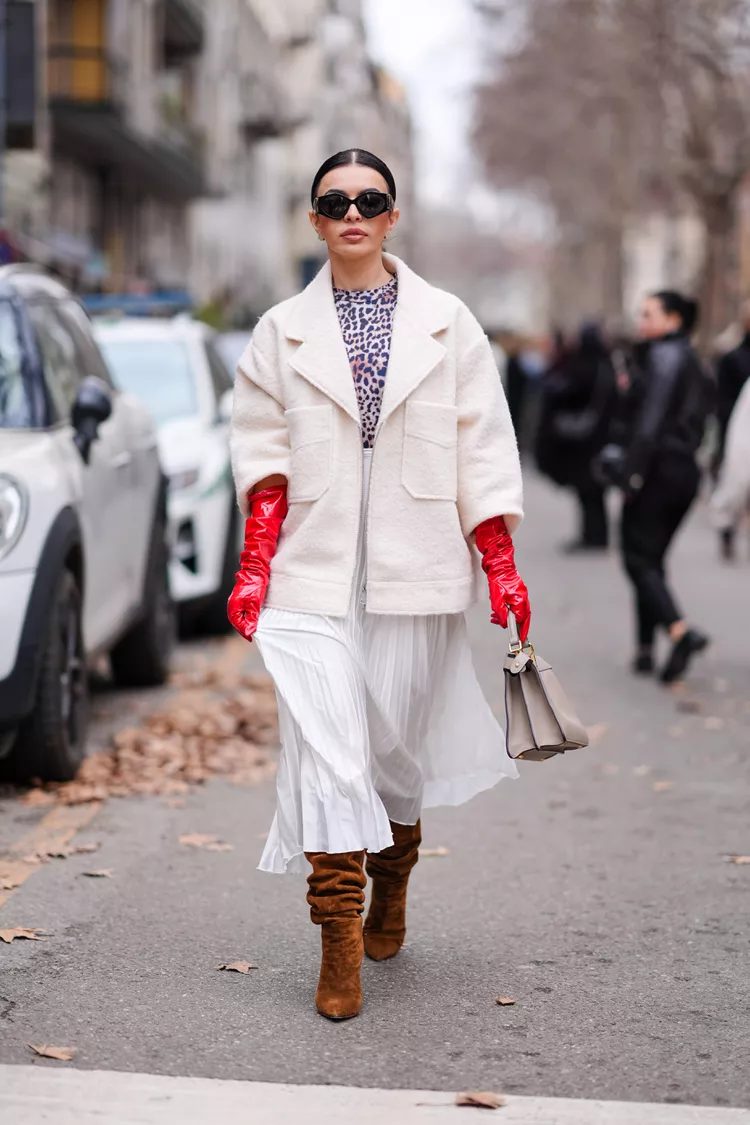 Leopard print has returned to fashion and seems to be here for good. If you are not ready to go all out with animal prints, layer a leopard-print shirt over a neutral jacket and pants. Add a pair red gloves, chunky, slouchy booties, and bold textures to your look if you want to take it a step further.