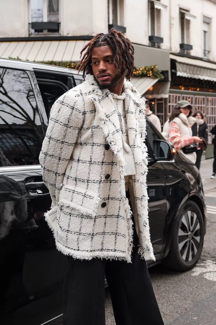 Tyler The Creator combined modern textures and styles to classic menswear items for a balanced, eclectic appearance. The kitschy sweater, arguably the father of grandfather-style clothing adds a fun, preppy style to classic denim jeans, and sophisticated loafers. Tyler’s retro style is modernized with a green trucker hat, cross-body bag and matching green trucker.
