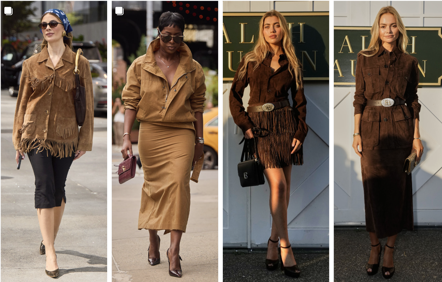 The resurgence of retro styles like Bohemian and Western Cowboy is palpable on the streets of New York Fashion Week. Hues inspired by biscuit and cherrywood, with their warm, earthy tones, further amplify the nostalgic mood. Key details like suede textures and leather fringes add texture and depth, while these colors, when paired with distressed or vintage-inspired pieces, create a cohesive narrative of timeless beauty and warm comfort.